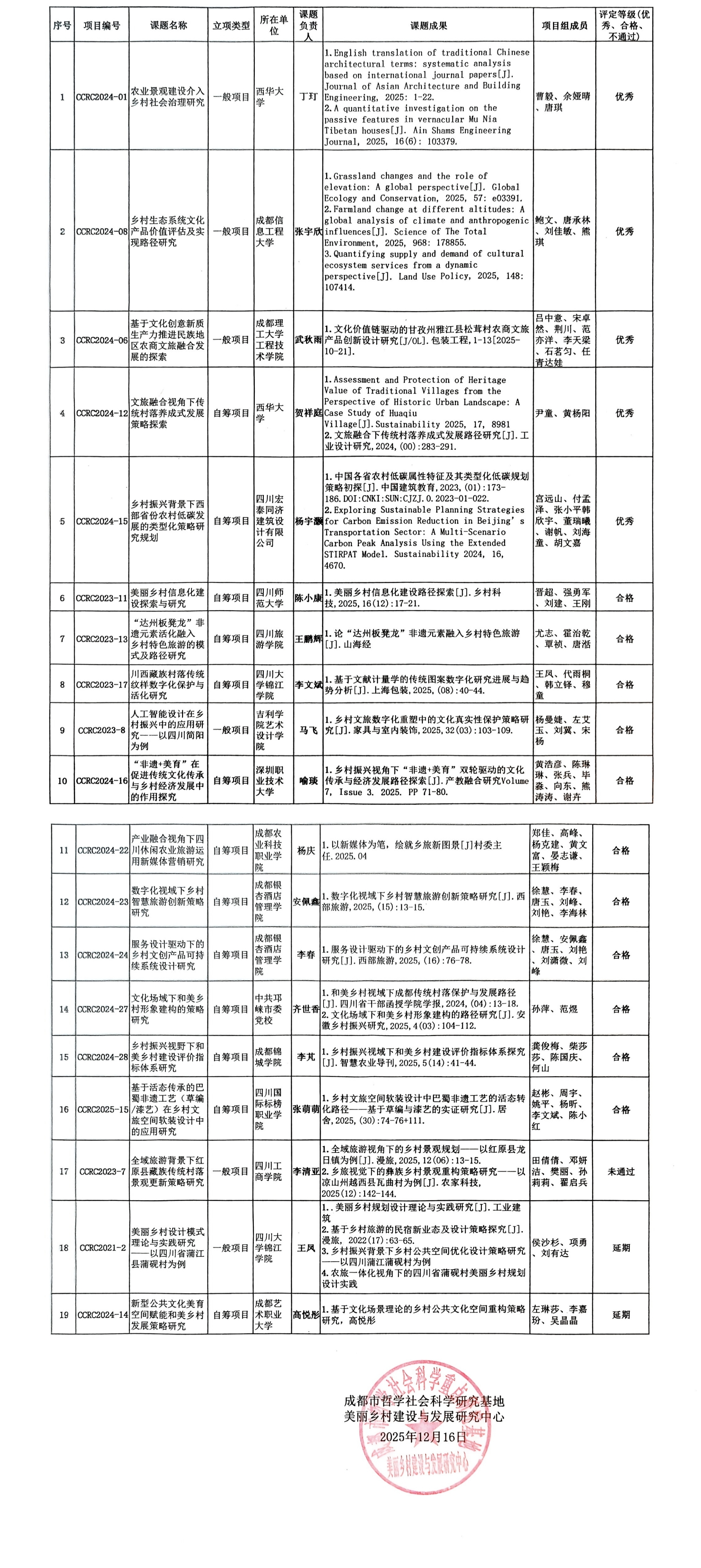2025年12月11日,经中心专家集中评审审定,2025年美丽乡村建设与发展研究中心共结项16项,其中优秀5项,合格11项,延迟2项,未通过1项,结项名单公示如下: